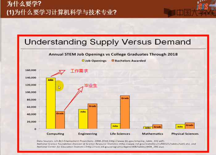 这张图是美国一个调查机构,那么所调查的2008-2018年期间的各个学科的人才需求和毕业生的供给情况 。
