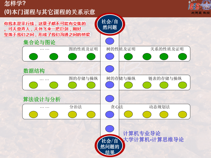 其它课程内容通常来讲都是横向组织教学内容,比如说集合论与图论,它会一个知识点一个知识点的来给大家进行讲解,比如说讲解图的性质及证明、树的性质及证明、关系的性质及证明等等,我们说这是一种横向的组织。