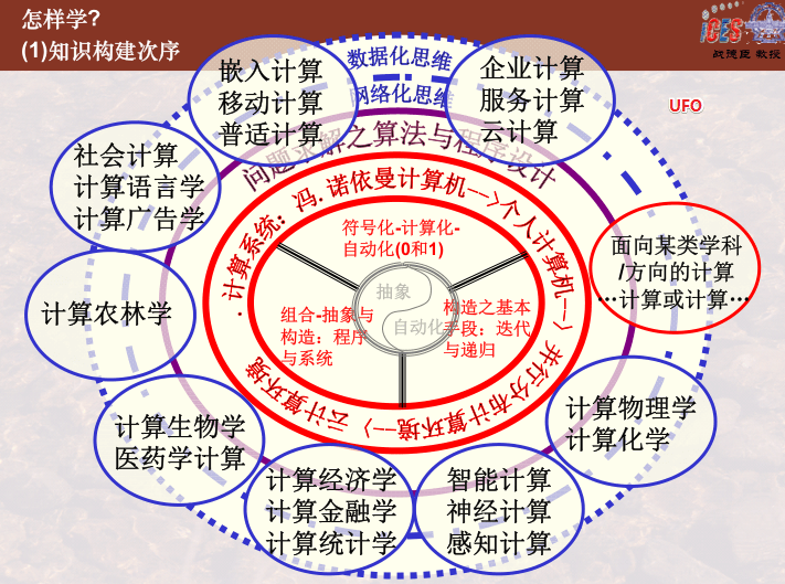 那么在此基础上我们要进一步学习的就是问题求解的算法与程序设计,再学习网络化思维,再学习数据化思维。 我们说这些思维的学习通常都要结合某一类计算、某一类社会/自然问题,结合起来学习是非常有意义的。所以在这里面来讲,我们说像这些内容:如何结合计算物理学、智能计算、神经计算、计算经济学、社会计算、计算生物学、计算农林学、社会计算、嵌入计算、企业计算、服务计算等等,结合这些问题来学习,这是非常重要的一个方面,一个非常重要的方面。