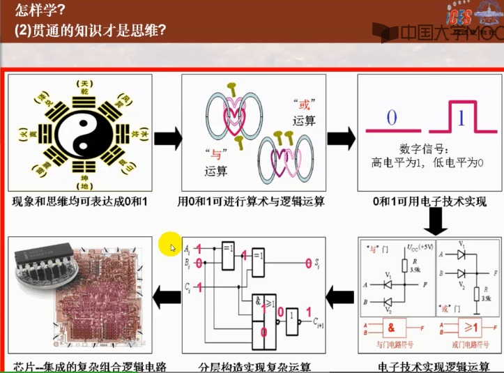 那么通过这张图我们可以看到什么是思维?在我们这里来讲,我们把贯通的知识称为叫做思维,因为我们说若干年以后,在这里面的细节内容我们可能早已忘掉了,但是我们由社会/自然现象→☞逻辑→☞二进制→☞电路→☞集成电路→☞计算机这样的一个思维,这样一个过程我们却是忘不了的,而我们说几十年以后、几年以后、几十年以后忘不了的东西,实际上对于我们来说,这才是一个思维,所以我们说知识的贯通就是思维,我们要学习如何贯通这种知识。