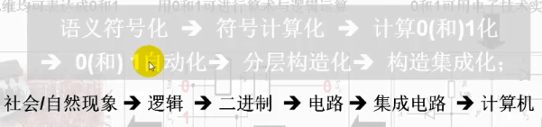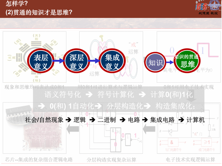 那么我们看这张图,它为我们揭示的是什么呢?揭示的是:由社会/自然现象→☞逻辑→☞二进制→☞我们说电路,再到集成电路,最后到计算机,也就是说揭示了如何由社会/自然现象、社会自然问题,最后到用计算机求解的整个的这样一个思维。所以体现出来,我们说就是语义符号化→☞符号计算法→☞计算0(和)1化→☞0(和)1自动化→☞分层构造化和构造集成化,那么具体内容我们后面去学习 ……