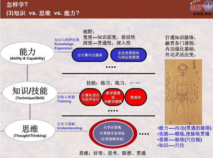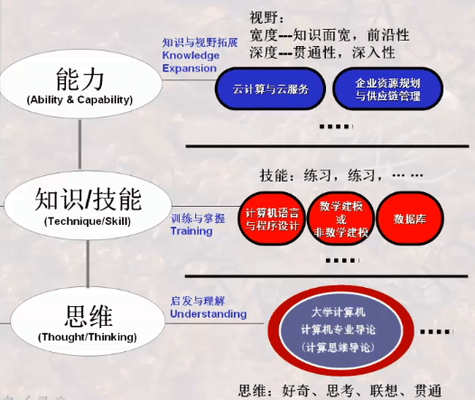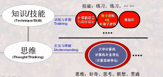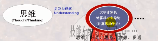 我们刚才说了,我们在大学阶段,那么贯通知识是一个很重要的方面,这种贯通可能在我们还不具有很细致的知识的前提下,我们来学会贯通,这是一个很难的一件事情,但是我们是必须要做的,因为我们要抬头看路,不可能我们都走过去了以后我们再回头来看,所以只能在很多的细节不清楚的情况下我们来看,所以我们要学习思维。思维重点是启发与理解,好奇、思考、联想、贯通,所以我们说大学的第一门课程,我们说应该学习计算思维,学习计算思维,这也是我们这门课的一个特点,也是我们这门课的一个目标。
