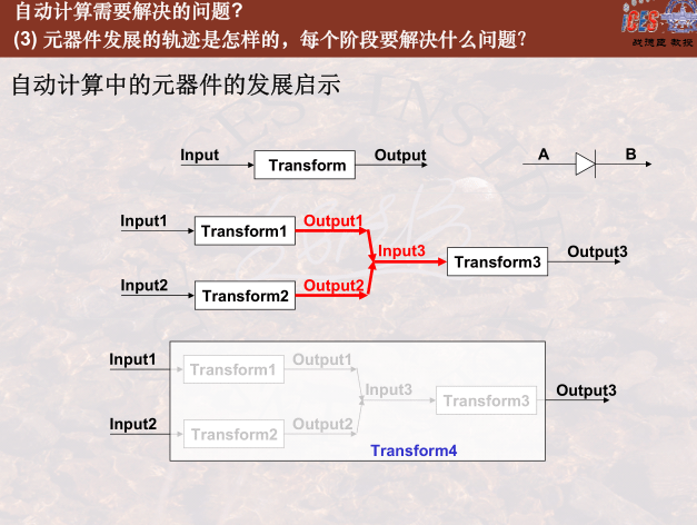 一个基本的元器件是能够完成由输入变换到输出的,元器件的相互组合,然后封装成一个具有特殊操作元器件,然后这个元器件又参与其它的封装,于是这个新出现元器件又更为强大了啊!最终的结果就是集成电路越来越复杂……