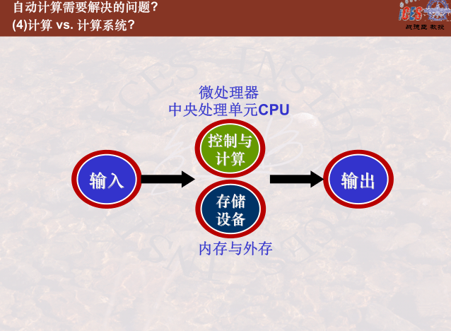 我们说像这样(图中的内容)的一个部分,就是计算机的一个基本的结构,包括输入输出、CPU和内存外存等存储设备