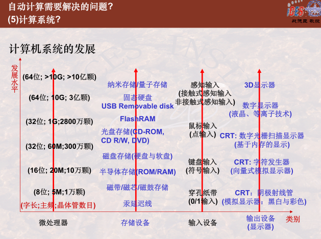 我们可以看到X轴这几个部分,分别是计算机的几个核心部分或者说核心的部件。我们可以把下面的当作是早期的计算机。而上面的则是现在的计算机。通过这个图可以看计算机(停顿,不是计算机系统而是系统的)系统的发展,我们在这里面只是简略地给大家做一个介绍。